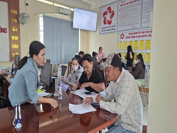 Công chức Trung tâm phục vụ hành chính công xã Tân Hòa, tỉnh Đồng Tháp hướng dẫn người dân. Ảnh: PV. Hoàng Minh, Đài TT xã Tân Hòa