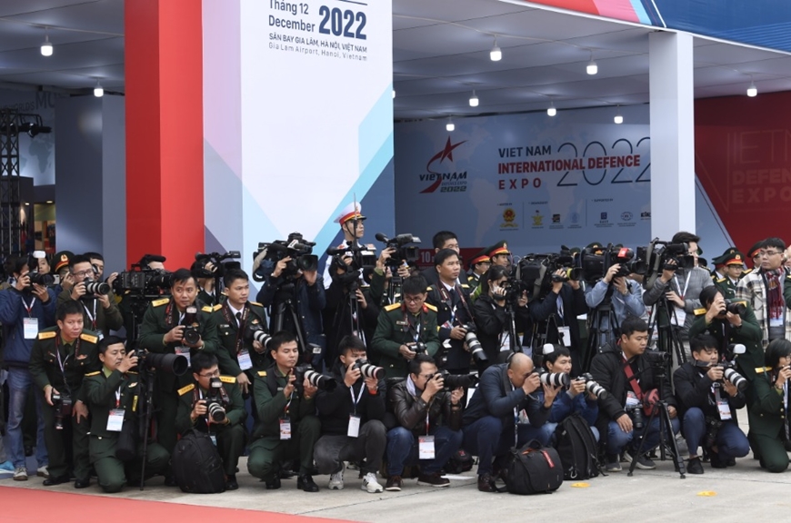 Phóng viên tác nghiệp tại Triển lãm Quốc phòng quốc tế Việt Nam 2022. (Ảnh: Tuấn Huy)